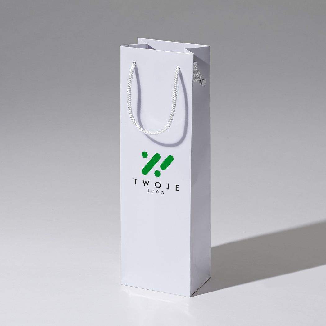 - rozmiar 12x8x38 (podst x wys) papier C2S 200g laminowany błyszczący, kolor biały,usztywniona góra 2x900g, dno torby 450g,uchwyt sznurek wiązany 5mm,2x50cm zadruk Pantone UV, zadruk CMYK, Hot Stamping (złocenie) minimalna ilość 100 szt.