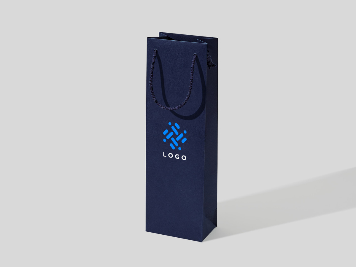- rozmiar 12x8x38 (podst. x wys.) kraft 160g,granatowy papier barwiony w masie, usztywniona góra 2x900g i dno torby 450g, uchwyt sznurek 5mm wiązany 2x50cm, zadruk Pantone Color, Pantone Metalic,Pantone White, Hot Stamping (złocenie), min ilość 100 szt.