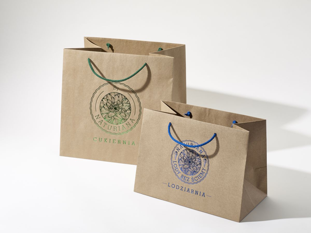 - rozmiar 17x8x20 (podst. x wys.) kraft 160g, naturalny beżowy, usztywniona góra 2x900g i dno torby 450g, uchwyt sznurek 5mm wiązany 2x50cm, zadruk Pantone Color, Pantone Metalic, Pantone White, Hot Stamping (złocenie), min ilość 100 szt.