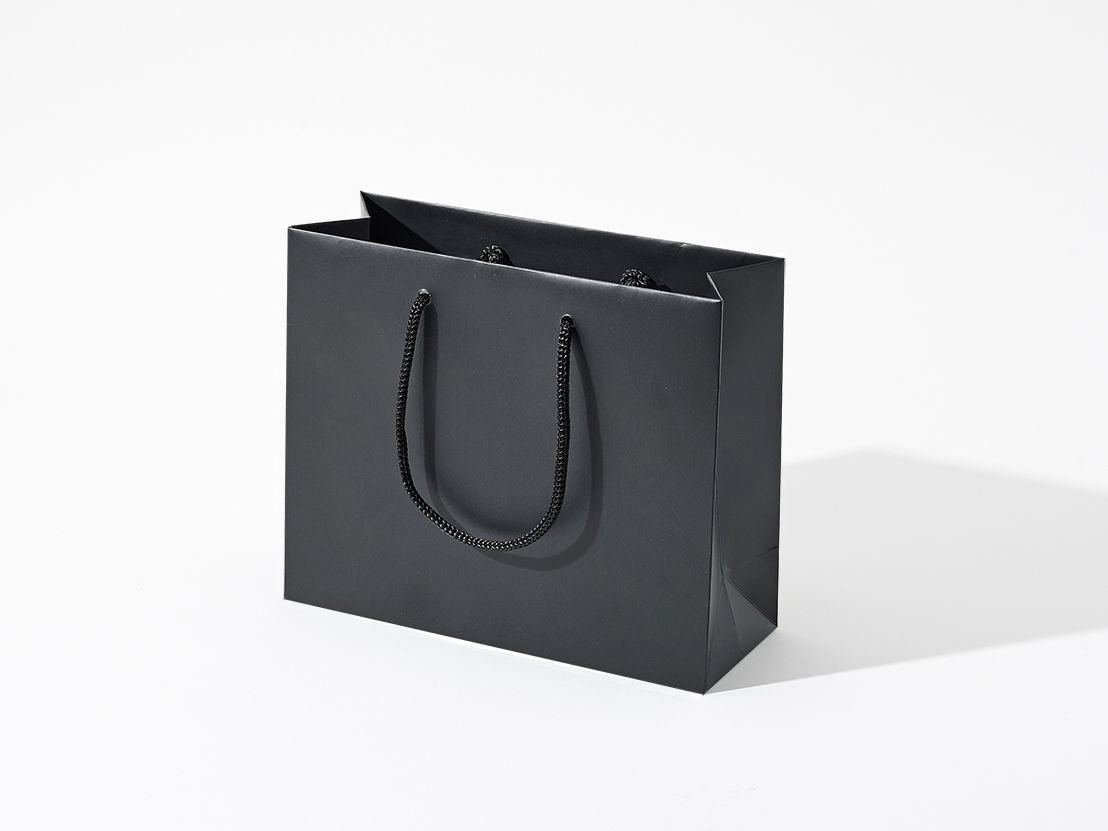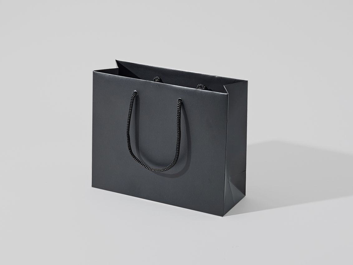 - rozmiar 24x9x20 poziom (podstawa x wysokość),papier C2S 200g z laminatem matowym, kolor Pantone black, usztywniona góra 2x1000g, dno torby 450g, uchwyt sznurek wiązany grubość 5mm, 2x50cm