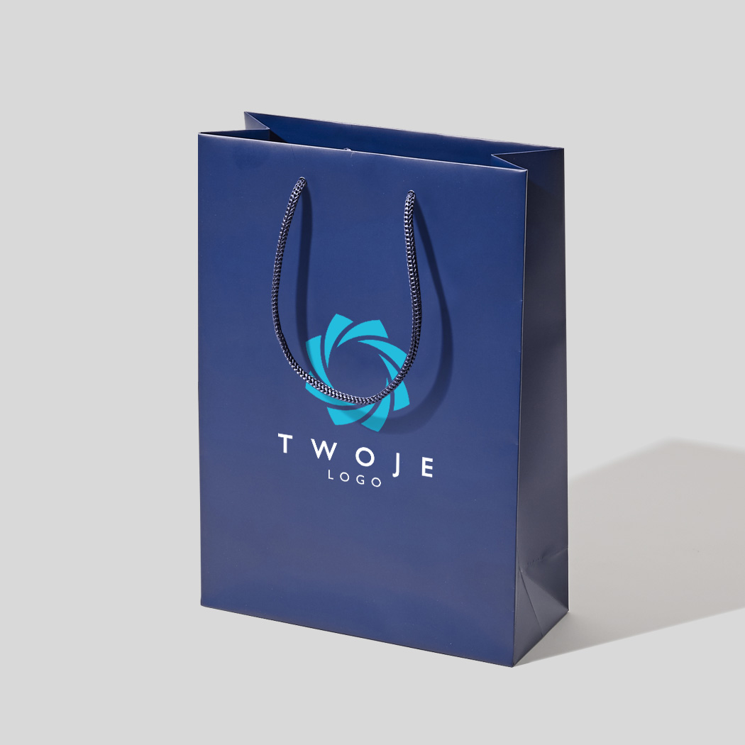 - rozmiar 24x9x34 (podstawa x wys.) papier C2S 200g z laminatem matowym, kolor Pantone blue 281, usztywniona góra 2x900g, dno 450g, uchwyt sznurek wiązany 5mm 2x50cm, zadruk Pantone UV, lakier UV , Hot Stamping (złocenie) min ilość 100 szt.