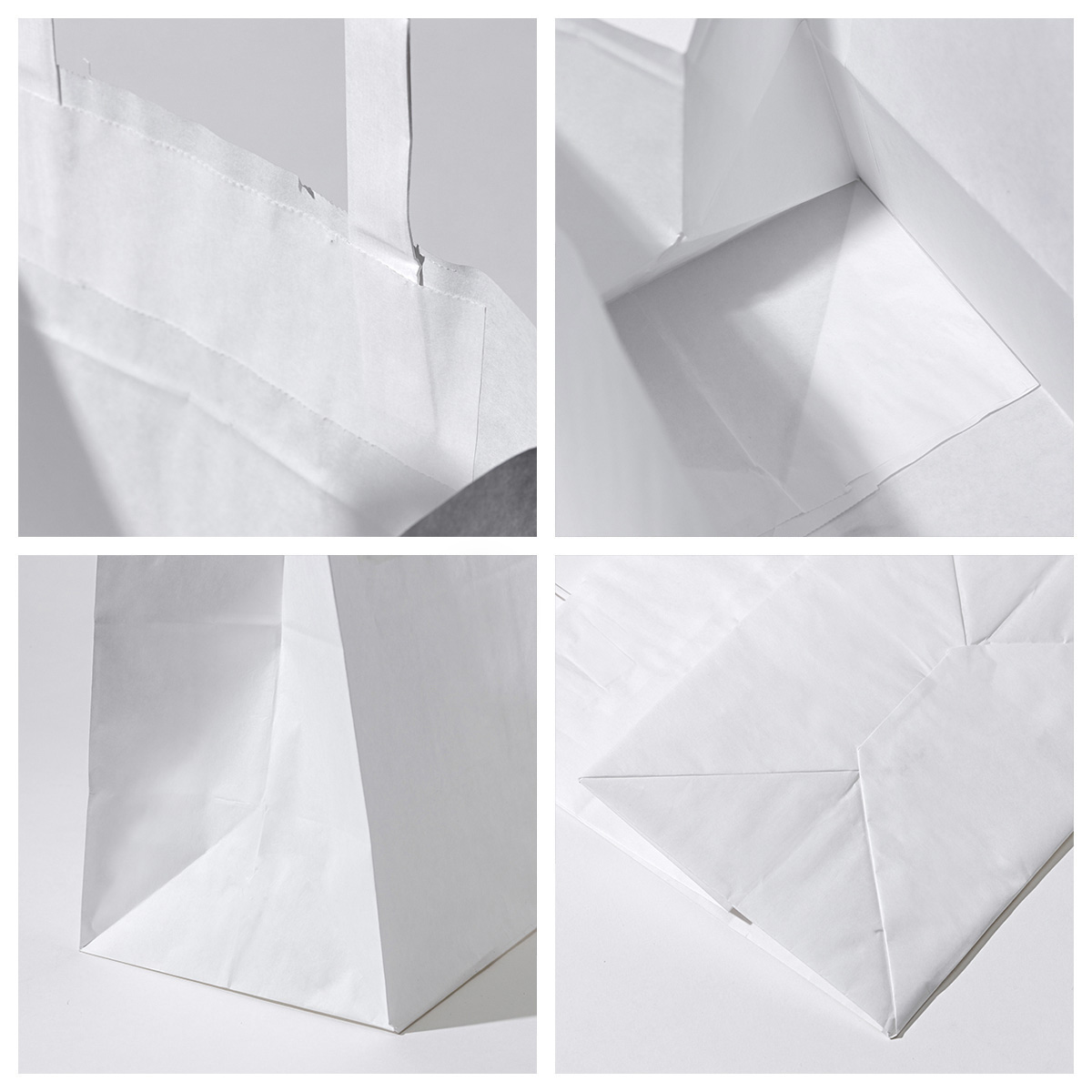 Torby wykonane z niepowlekanych, naturalnych papierów kraft w kolorze beżowym i białym w gramaturze 70-90g. W przypadku papierów naturalnych kraft, mogą wystąpić nieznaczne różnice kolorystyczne pomiędzy poszczególnymi partiami toreb, oraz różnice kolorystyczne pomiędzy torbą a uchwytem