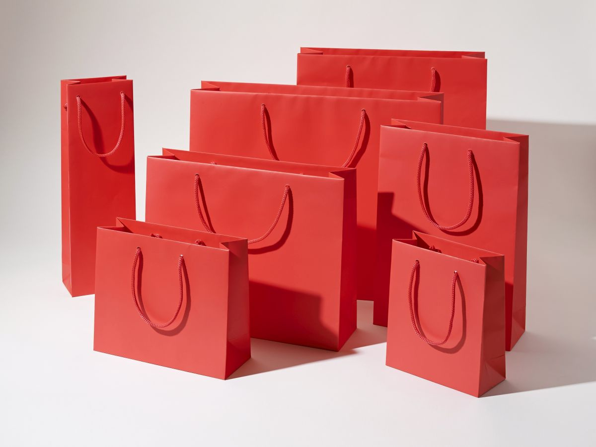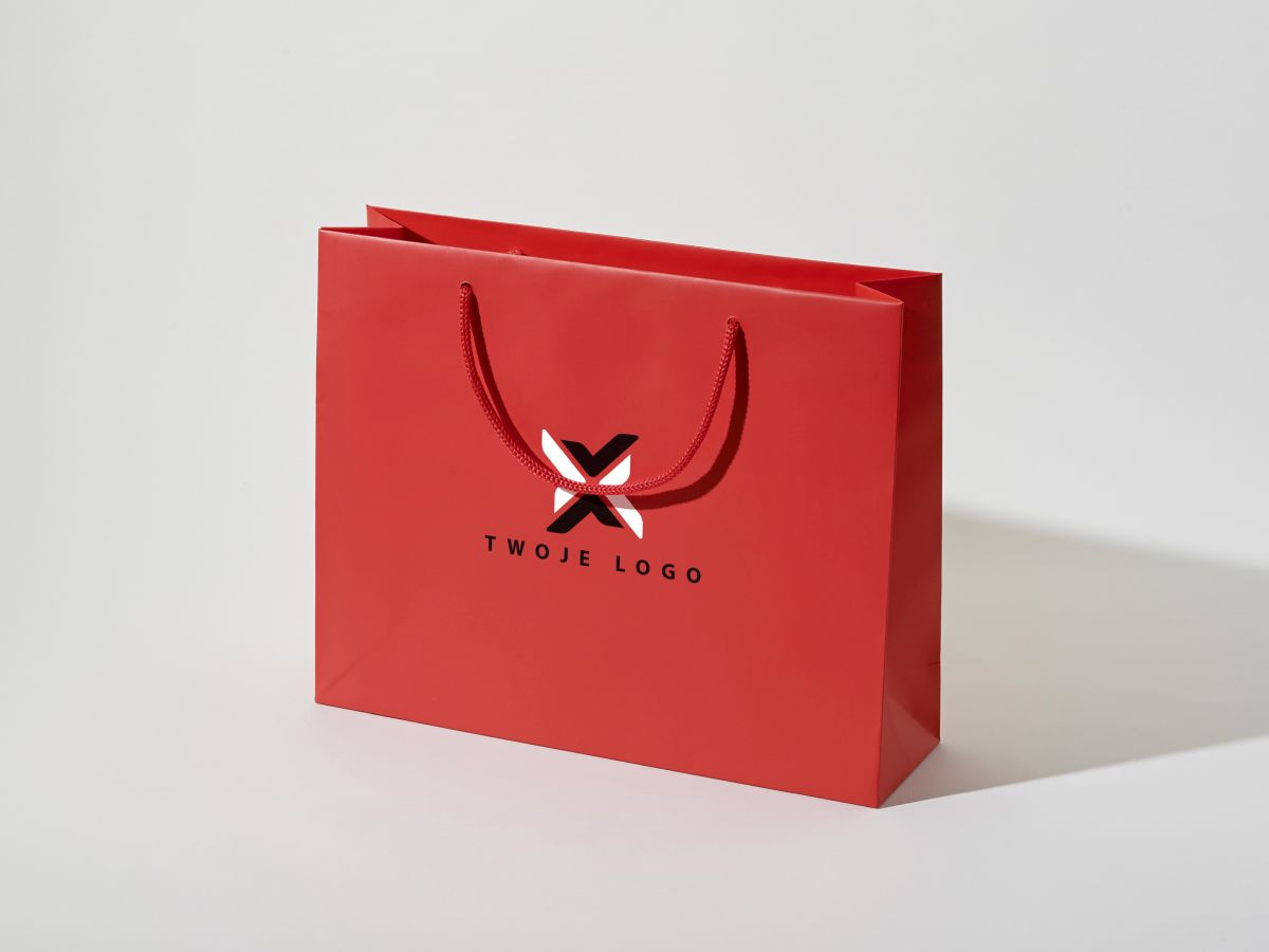 - rozmiar poziomy 35x10x28 (podstawa x wys.)papier C2S 200g z laminatem matowym, kolor torby Pantone red 2034, usztywniona góra 2x1000g, dno torby 450g,uchwyt sznurek wiązany 5mm, 2x50cm zadruk Pantone UV, Hot Stamping (złocenie) minimalna ilość 100 szt.