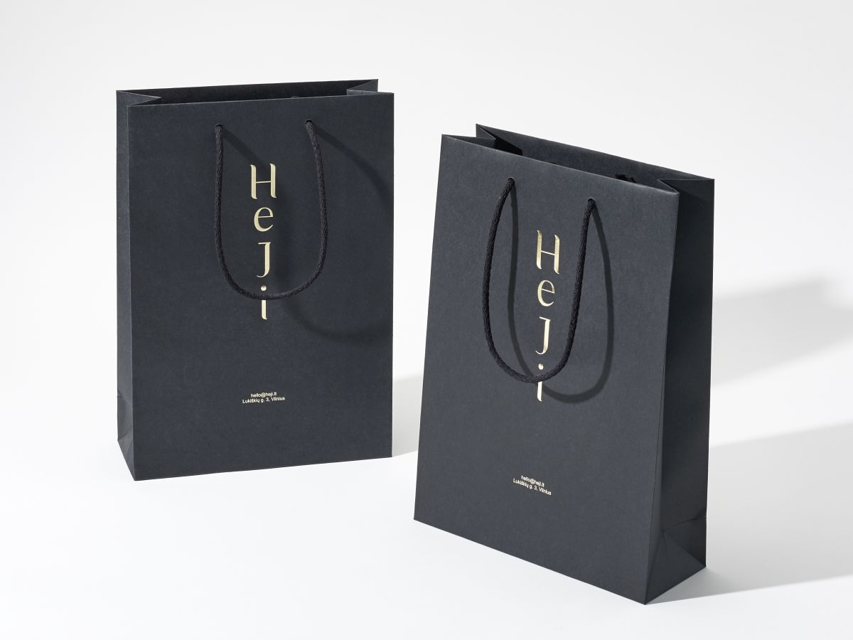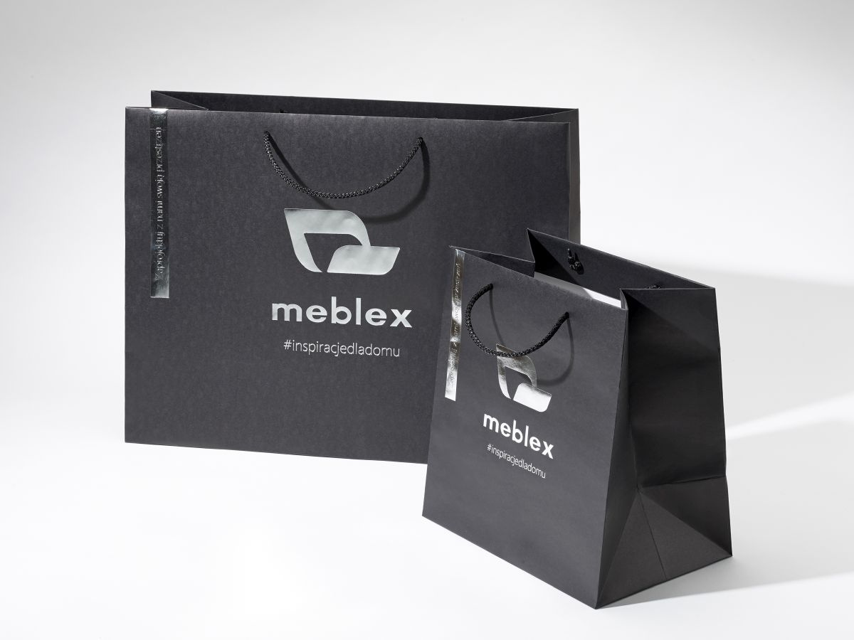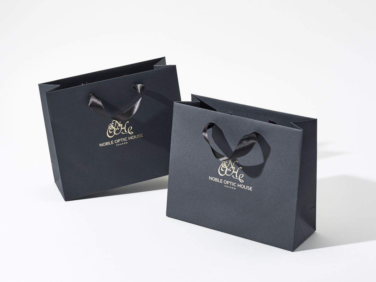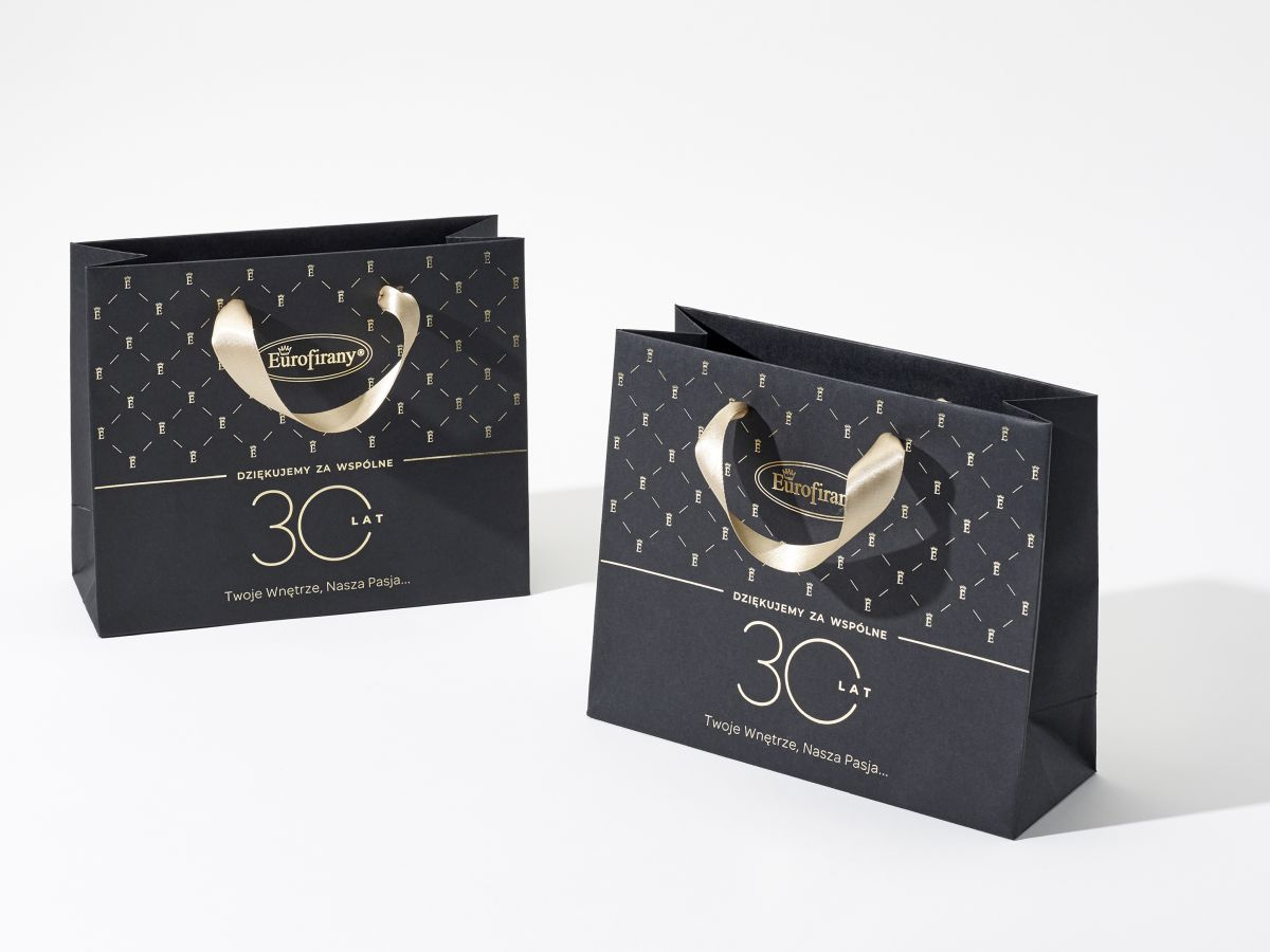 - czarny papier 160g barwiony w masie, usztywniona góra 2x900g i dno torby 450g, uchwyt sznurek 5mm wiązany 2x50cm, zadruk Pantone Color, Pantone Metalic, Pantone White, Hot Stamping (złocenie), min ilość 100 szt.