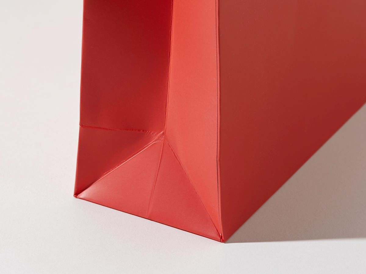 - rozmiar poziomy 24x9x20 (podstawa x wys.) papier C2S 200g z laminatem matowym, kolor Pantone red 2034, usztywniona góra 2x1000g, dno 450g, uchwyt sznurek wiązany 5mm 2x50cm, zadruk Pantone UV, lakier UV , Hot Stamping (złocenie) min ilość 100 szt.