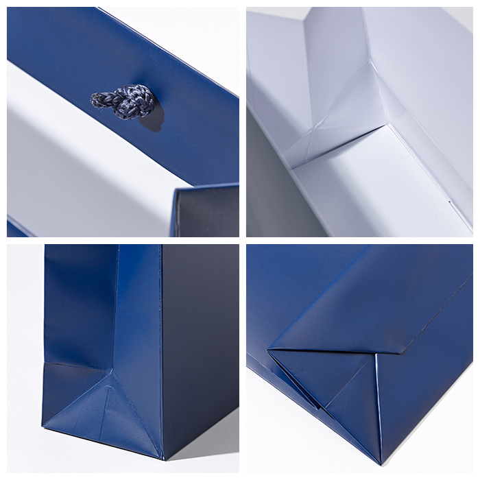 Torby z dodatkowymi wzmocnieniami zabezpieczone laminatem matowym lub błyszczącym. Wykonane z sztywnego i mocnego papieru kredowanego C2S 200g w podstawowych kolorach : białym, granatowym, czarnym oraz srebrno - szarym i czerwonym. Inne kolory i motywy wprowadzane są sezonowo
